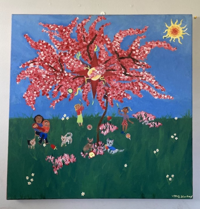Heartwarming + estranged love is a painting about an unconventional family ; pets , foster sisters from different families , a grandmother with her grandchildren. Everyone enjoying a party under a cherry blossom tree .