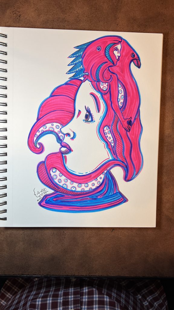In this piece, I pushed further into the fluid connection between body and form. The oversized face—my signature element-now flows seamlessly into a full figure, one that becomes part bird, part protector. I’m experimenting with bold lines and vibrant color contrast-pink, blue, and red-to create tension and movement. There’s a surreal quality: a woman wrapped in feathers, held within the shape of a bird, emerging from her own thoughts. Tentacle-like shapes curl around her, echoing an inner world as alive as the outer one. This work is a step forward-unapologetically bold, organically human, and confidently evolving in style.